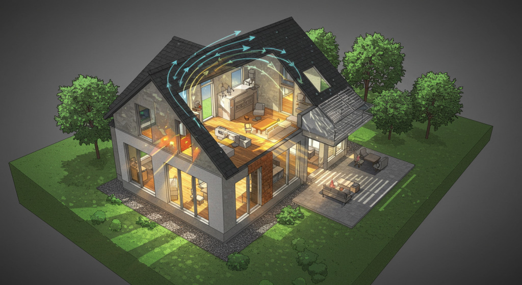 Before technology, we start with wisdom. Using site orientation, natural ventilation, and thermal massing, we reduce reliance on artificial systems. Key elements include: